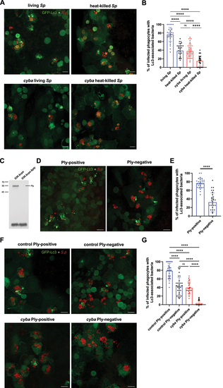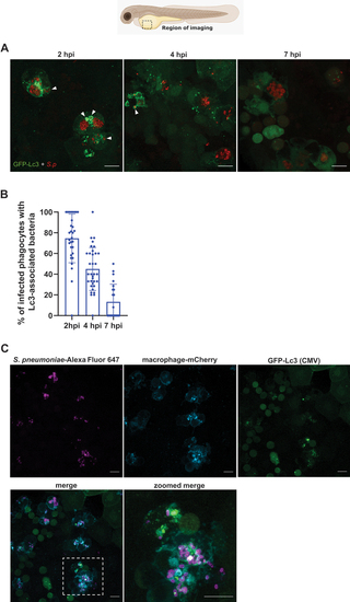 Live and pnemolysin-positive pneumococci are required to fully induce Lc3-mediated response within zebrafish macrophages. (A) Representative confocal images of |