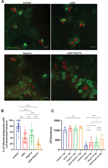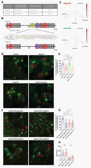 Tecpr1a, a likely ortholog of human TECPR1, controls ply-mediated autophagic response to pneumococci. (A) Table summarizing the alignment of zebrafish Tecpr1a and Tecpr1b proteins to the human TECPR1 protein. Columns display percentage positives (identical amino acids, as well as conserved or semiconserved substitutions) and length of the proteins. Alignments sequence similarities are shown for the full-length protein and the AIR domain, which exhibits the greatest divergence between the zebrafish paralogues (Tecpr1a and Tecpr1b). (B) Schematic representation of zebrafish Tecpr1a and Tecpr1b proteins, showing their domains: DysF – Dysferlin, AIR – ATG5-interacting region, and PH – Pleckstrin homology domain. Alignment of the AIR domain amino acid sequence of human TECPR1 and the zebfafish orthologs, Tecpr1a and Tecpr1b, is shown between the schematics. Symbols denote: (*) identical residues, (:) conserved substitutions, and (.) semiconserved substitutions. (C) Gene expression of adult zebrafish leukocytes determined using the zebrafish blood atlas [ |