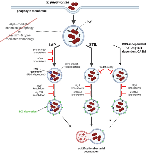 Model of autophagic response to pneumococci within zebrafish macrophages. After internalization by phagocytes, pneumococci are sequestered within Lc3-decorated vacuoles which are formed by three independent mechanisms: ROS-dependent LAP or two ROS-independent Ply-mediated pathways including STIL. LAP occurs as a result of osmotic imbalance within bacteria-containing phagosome caused by ROS production by NADPH oxidase. In contrast, STIL is induced upon membrane perturbation caused by secretion of bacterial pneumolysin manifested by sphingomyelin presence on the outside leaflet of the phagosome. STIL is dependent on Tecpr1a which recognizes sphingomyelin and mediates Lc3 lipidation. Last, the Atg16l1- and Ply-dependent pathway contributes to the smallest portion of Lc3 lipidation. However, the specific mechanisms controlling this process remain to be revealed. Following Lc3-assisted vacuolar sequestration, pneumococci are more efficiently targeted for lysosomal degradation and the Lc3 decoration is removed. The classical xenophagy receptors (sqstm1 and optineurin) as well as the canonical autophagy initiation molecule (atg13) are dispensable in this model. Despite the absence of these xenophagy-mediating factors, the bacteria are efficiently degraded. Figure created with BioRender. |