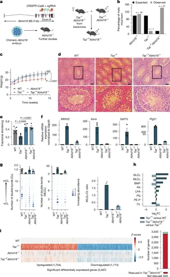 Abhd18 perturbation in Taz−/Y mice rescues BTHS phenotypes. a, Schematic showing the generation of Abhd18−/− and Taz−/Y;Abhd18−/− mice. b, Bar plot depicting the proportions of male mice for the indicated genotypes. The expected Taz−/Y and Abhd18−/− numbers follow the null hypothesis that there is no effect on the number of male mice born; Taz−/Y;Abhd18−/− follows the null hypothesis that there is no rescue of the observed Taz−/Y phenotype. Observed shows the proportion of mice genotyped. c, Body weight of mice more than ten weeks after weaning. Data are mean ± s.d. (WT, n = 8; Taz−/Y, n = 5; Abhd18−/− and Taz−/Y;Abhd18−/−, n = 13 mice). Significance was determined by one-way ANOVA followed by Dunnett’s post-hoc test (Padj = 0 WT versus Taz−/Y at week 14). d, Representative haematoxylin and eosin-stained histological images of mouse testis. White arrowheads show the nuclei of mature sperm in the lumen of seminiferous tubules (inset). The bottom row shows rotated zoomed-in images of the areas in the black boxes. Scale bars, 50 μm. e, Bar graph showing fractional shortening quantified by ultrasound analysis of murine hearts. Data are mean ± s.d. (WT, n = 7; Taz−/Y, n = 5; Abhd18−/−, n = 4; Taz−/Y;Abhd18−/−, n = 7). Significance was determined by one-way ANOVA followed by Tukey’s multiple comparisons test. f, RT–qPCR analysis of indicated gene expression levels from murine hearts, normalized to Gapdh. Data are mean ± s.e.m. (n = 3 mice). Significance determined by one-way ANOVA and Tukey’s multiple comparison test. g, Dot plots of lipidomic analyses of CL (left) and MLCL (middle) species abundance in murine hearts, with summary bar plots shown above. Right, bar plot quantifying MLCL/CL ratios (right). Data are means; n = 6 mice per genotype, except Taz−/Y (n = 4). h, Bar plot of lipid abundance changes in Taz−/Y versus WT, and Taz−/Y;Abhd18−/− versus Taz−/Y murine hearts (n as in panel g). i, Bulk RNA-seq analysis of murine hearts (n = 3 mice per genotype). Significant differentially expressed genes in each genotype (FDR < 0.01, |LFC | > 0.58) are shown, z-normalized to WT samples (left). Right, bar plot showing the number of Taz-KO genes rescued in Taz−/Y;Abhd18−/− mouse heart (right). |