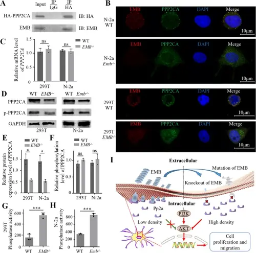 EMB activates PI3K pathway by recruiting PP2A to the cell membrane. A, Co-IP between EMB and PPP2CA in N-2a cells. B, Immunofluorescence staining of EMB (red) and PPP2CA (green) in WT or Emb-/- N-2a or 293 T cells. The yellow puncta indicate co-localization (C), Ppp2ca mRNA expression levels determined by RT-qPCR. D, Upon fractionation, western blots of total and phosphorylated membrane-associated Ppp2ca in 293 T or N-2a cells. E and F, Quantification of the protein levels in panel D. G and H, The Serine/threonine phosphatase activities of PP2A enzymes in the cytoplasmic fraction. ns, not significance; *, p < 0.05; ***, p < 0.001. I, A working model of EMB function in PI3K signaling |