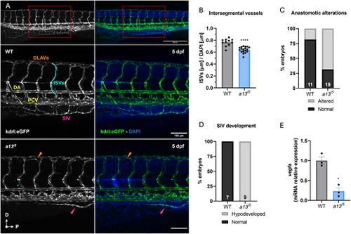 ADAMTS13 deficiency impairs vascular developmental patterning. (A) Representative confocal images of the trunk vasculature of casper;kdrl:eGFP transgenic zebrafish at 5 dpf. Top panels show an overview of the tail vasculature (10×), the red rectangle highlights the area of the trunk considered for the analysis. Scale bar: 300 μm. Mid panels show a WT embryo, kdrl:eGFP in grey (left), and the merge with DAPI (right). Lower panels show an a13i5 mutant embryo, kdrl:eGFP in grey (left) and the merge with DAPI (right). Scale bar: 100 μm. (B) Quantification of ISV length (µm) normalized to DAPI in WT (grey) and a13i5 (blue) embryos. (C) Percentage of embryos with normal (black) or altered (grey) anastomotic connections in WT and a13i5 mutants. (D) Percentage of embryos with normal (black) or hypodeveloped (grey) SIV plexus in WT and a13i5 mutants. (E) Relative mRNA expression levels of vegfa in WT and a13i5 embryos, normalized to the housekeeping gene ube2a, and shown as fold versus WT. Data are shown as mean±s.d. Each dot represents a biological replicate. *P≤0.05, **** P≤0.0001 by unpaired Student's t-test. DA, dorsal aorta; DLAV, dorsal longitudinal anastomotic vessel; ISV, intersegmental vessel; PCV, posterior cardinal vein; SIV, subintestinal vein. |